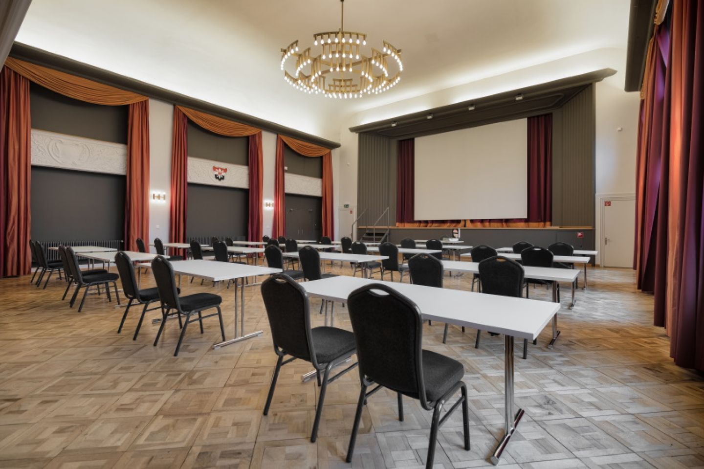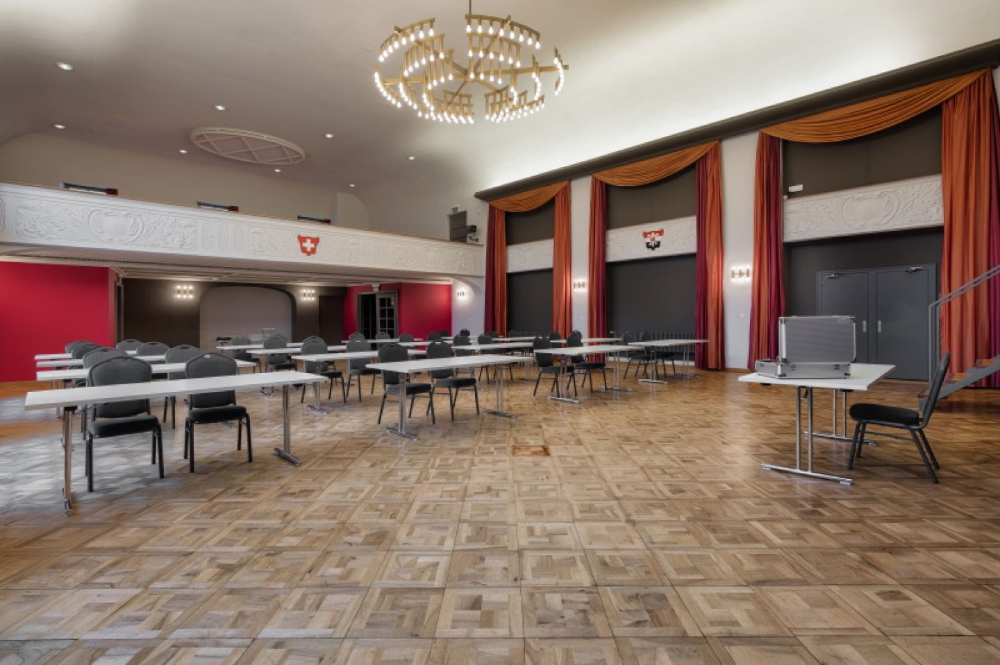 Bei einer Theaterbestuhlung sind bis zu 300 Teilnehmer möglich. Planen Sie ein Gala-Dinner oder Bankett? Dann ist eine Gästeanzahl zwischen 150 und maximal 180 Teilnehmern ideal. In der Eventlocation Casino Saal Schönenwerd erhält Ihre Veranstaltung den passenden Rahmen. Nicht zuletzt tragen die perfekt gedeckten Tische, der Parkettboden sowie die Empore dazu bei, dass der Saal ein festliches Ambiente ausstrahlt.