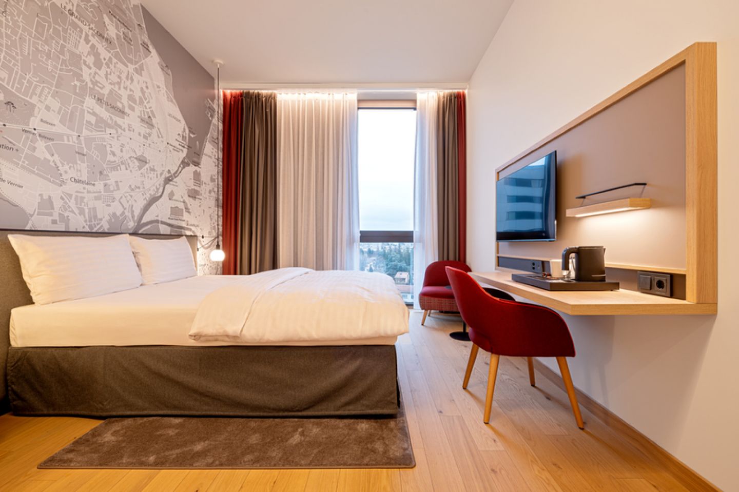 Thanks to the FreeCityTicket, you can use public transport in Geneva free of charge. The nearest streetcar is just a two-minute walk away and the airport can be reached in five minutes by car. For those arriving by car, there is an underground garage with direct access.
