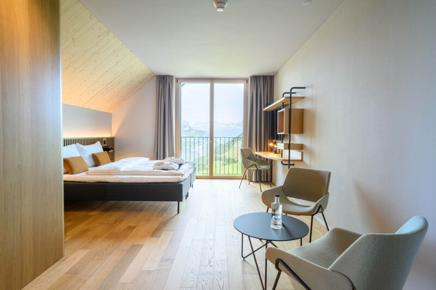 Sustainability is a top priority: the Stoos Lodge uses a unique energy concept – braking energy and waste heat from the Stoosbahn provide the hotel with heat and hot water, significantly reducing fossil fuel consumption.